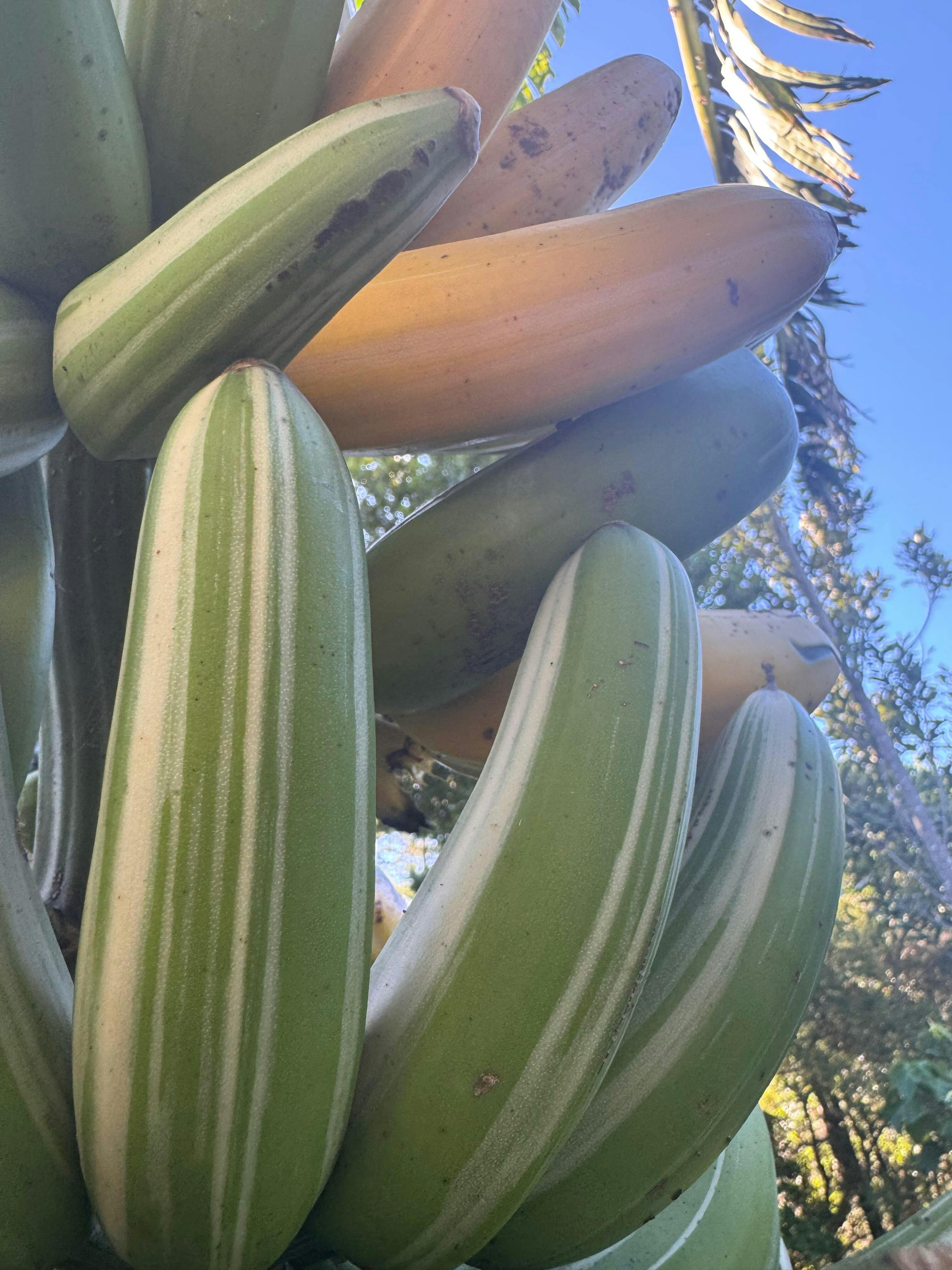 The Royal Hawaiian banana, also known as Musa Ae Ae, is a rare and exquisite banana tree indigenous to Hawaii. Highly sought after globally, this cultivar stands out for its striking variegation on its leaves and fruit, making it a prized asset in any sub-tropical or tropical garden. This tall, upright tree can reach heights of 5-6 meters, featuring expansive leaves with a creamy white and green variegation. The bananas produced on this very ornamental plant are also edible, which are creamy and sweet, similar to other bananas cultivated for their fruit in New Zealand.