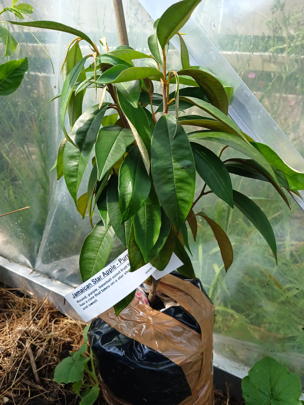 Purple star apple (Chrysophyllum cainito), also known as milk fruit and originating from South America, is highly appealing due to its attractive appearance. It thrives in well-drained soil and can be pruned into desired shapes once it reaches maturity (around 8-10 years).